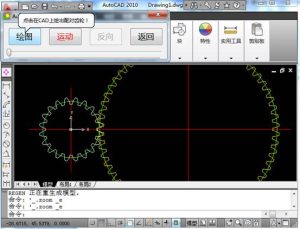 计算完后,这时上图红圈处由灰变亮了,点击可以连接上AutoCAD2010,并显示工具栏,点击上面的“绘图”按钮,就可绘出齿轮啮合图型,如下图所示: